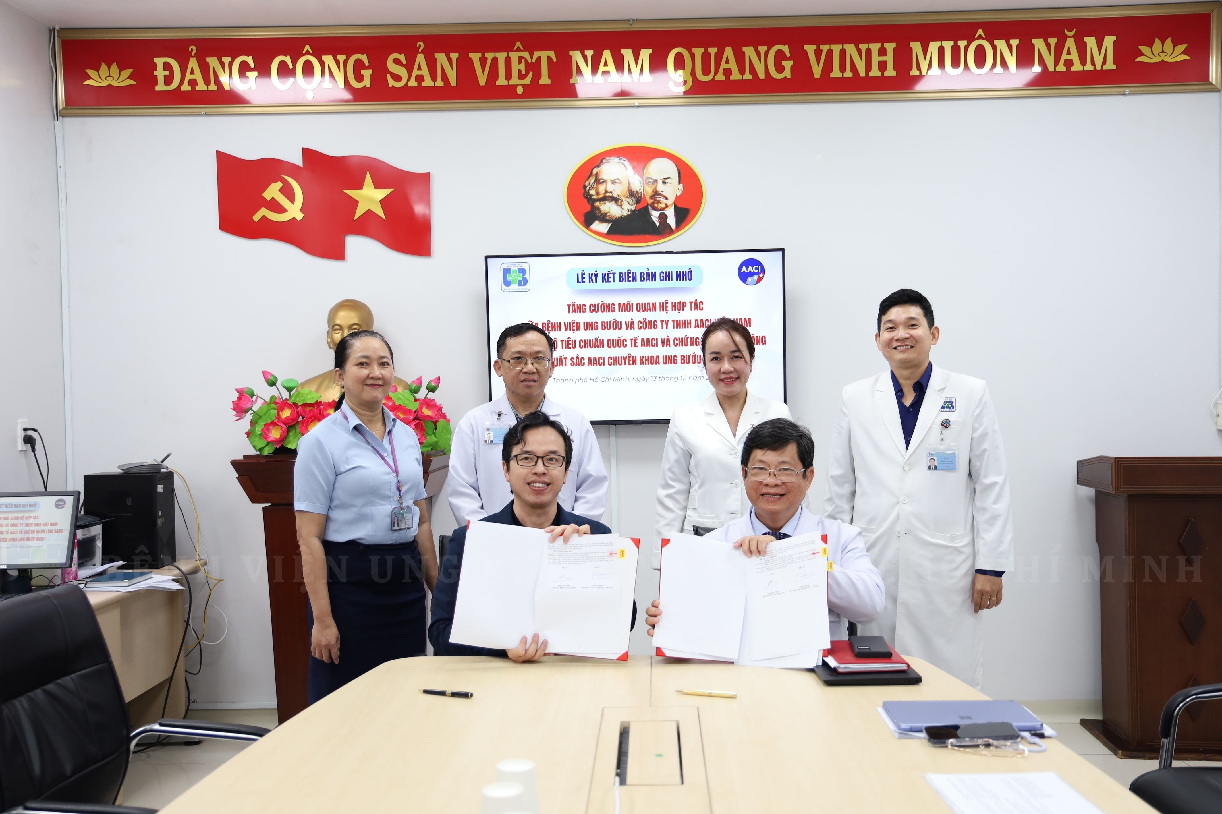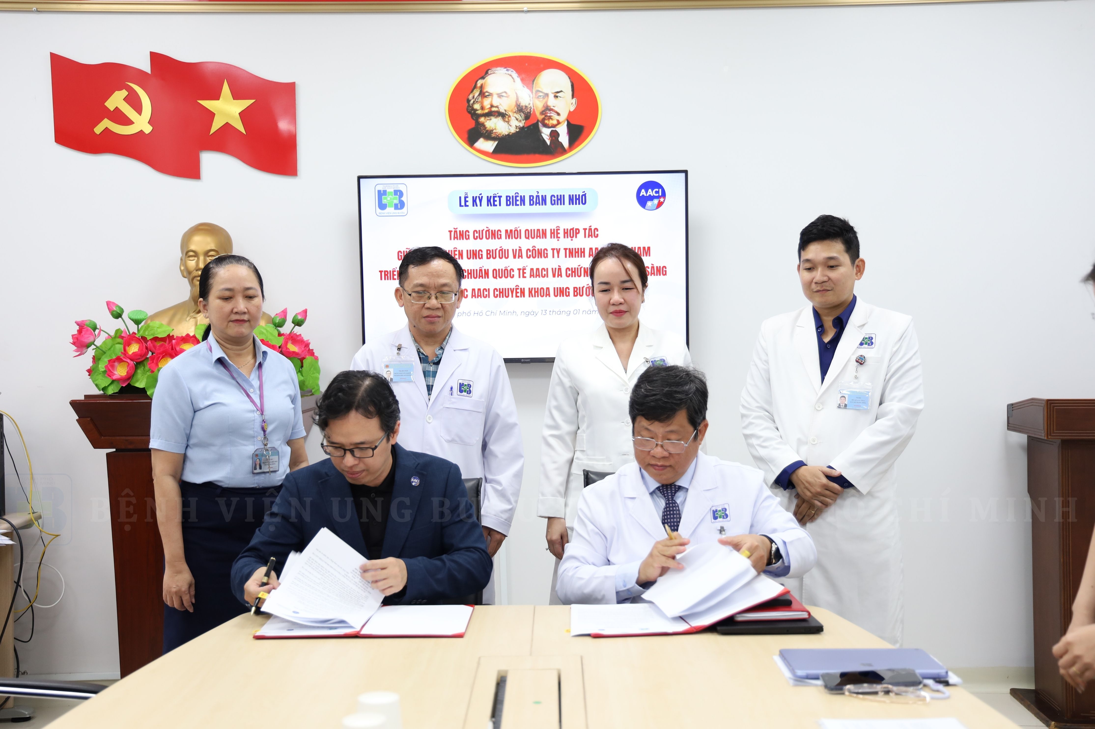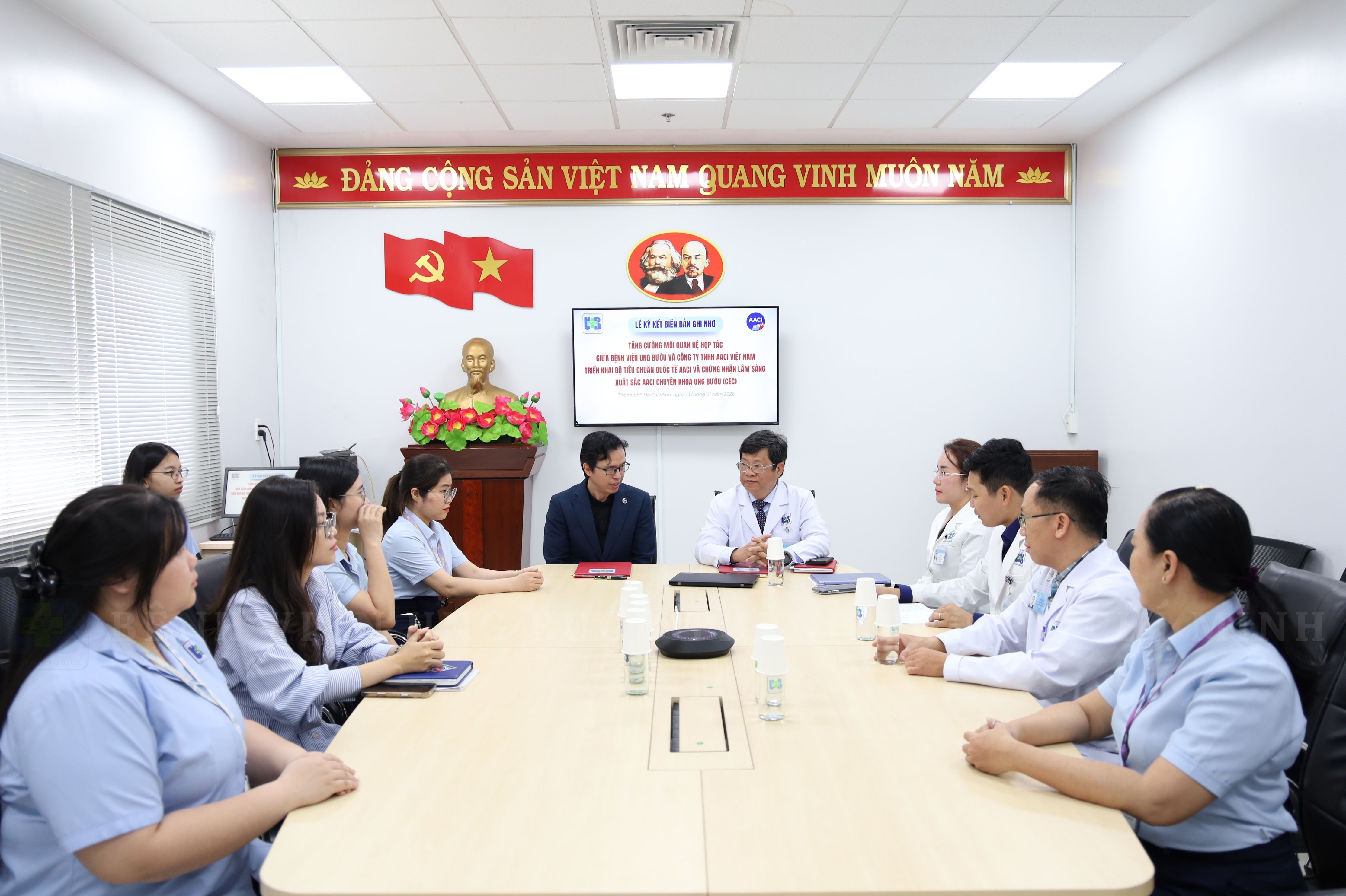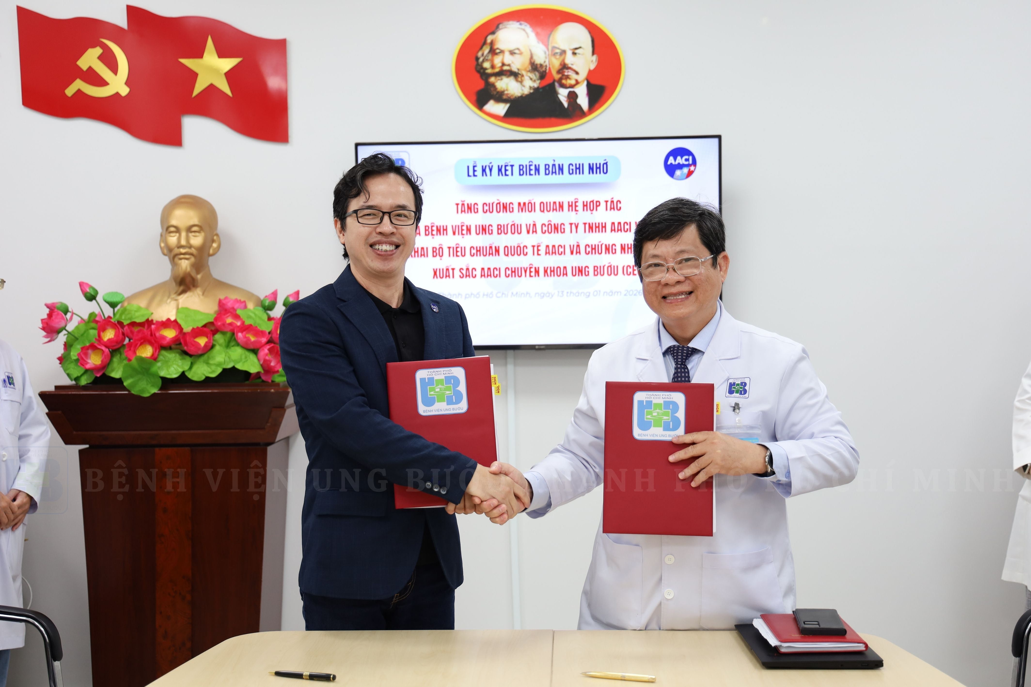 Sáng ngày 13/01/2026, Bệnh viện Ung Bướu TP.HCM đã diễn ra lễ ký kết Biên bản Ghi nhớ (MOU) với Công ty TNHH AACI Việt Nam. Tham dự buổi lễ có sự hiện diện của ông Diệp Bảo Tuấn – Giám đốc Bệnh viện Ung Bướu TP.HCM và ông Lê Bình Phương – Giám đốc Quốc gia AACI tại Việt Nam, cùng các đại diện lãnh đạo từ cả hai bên.