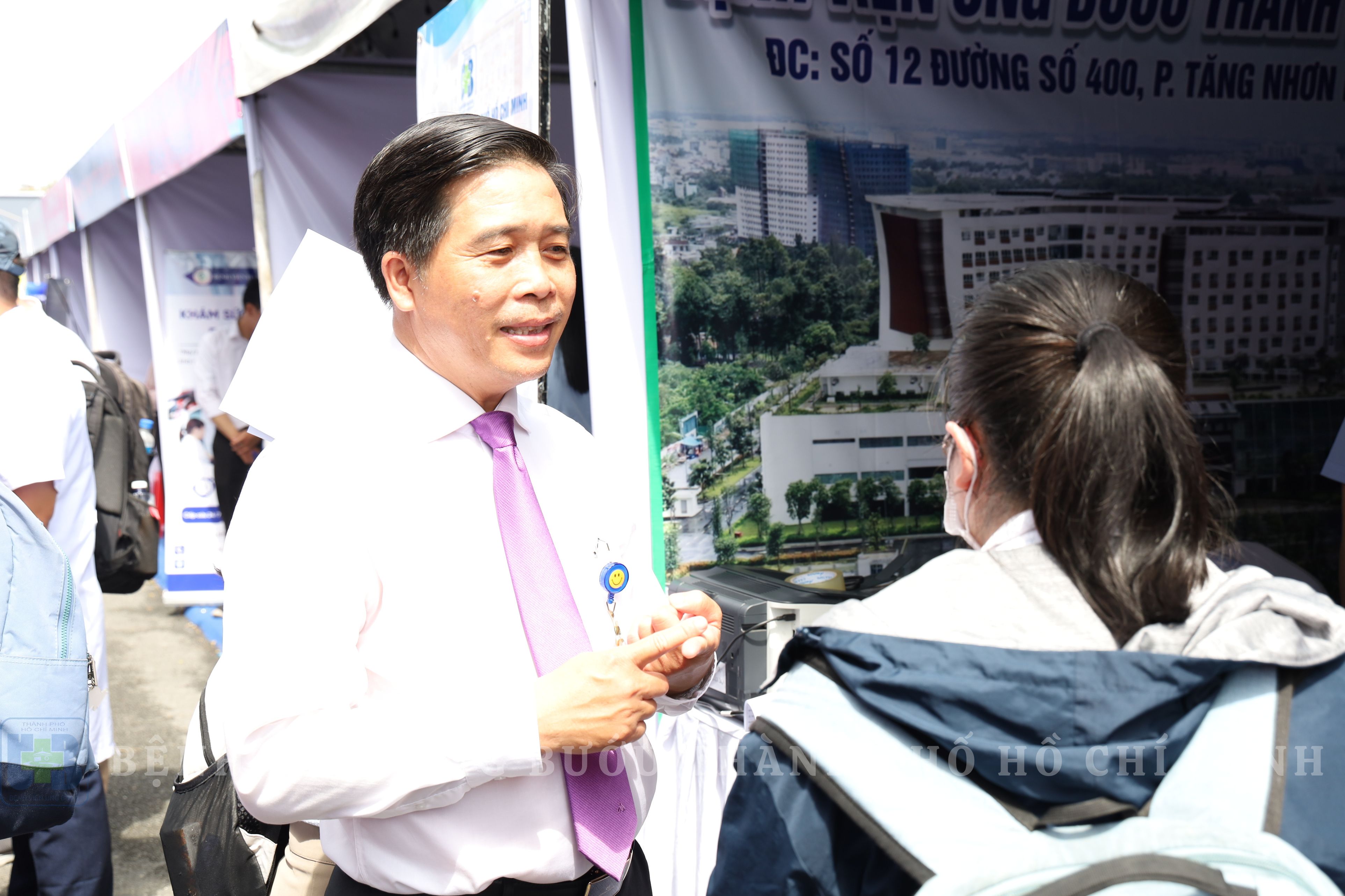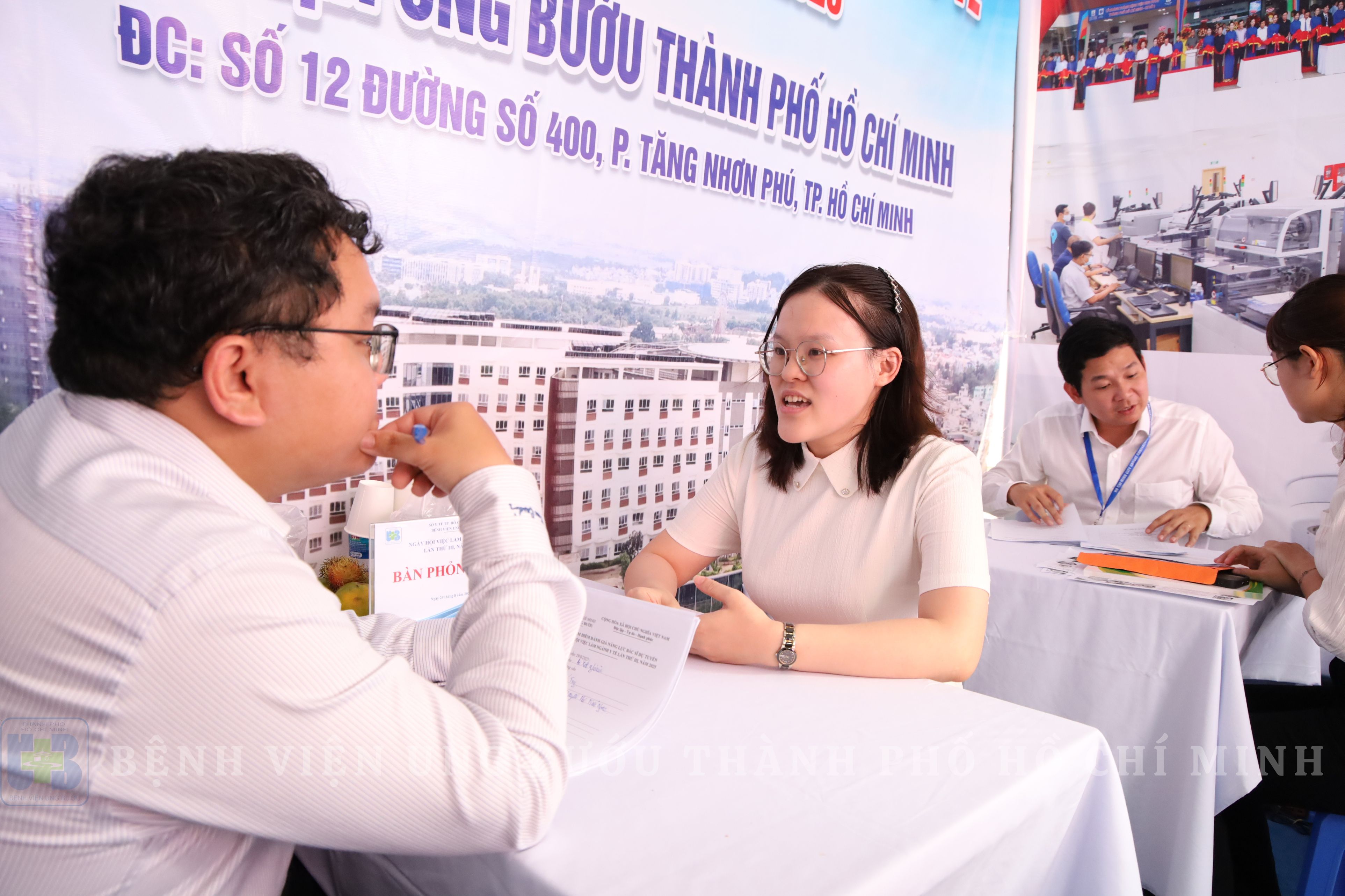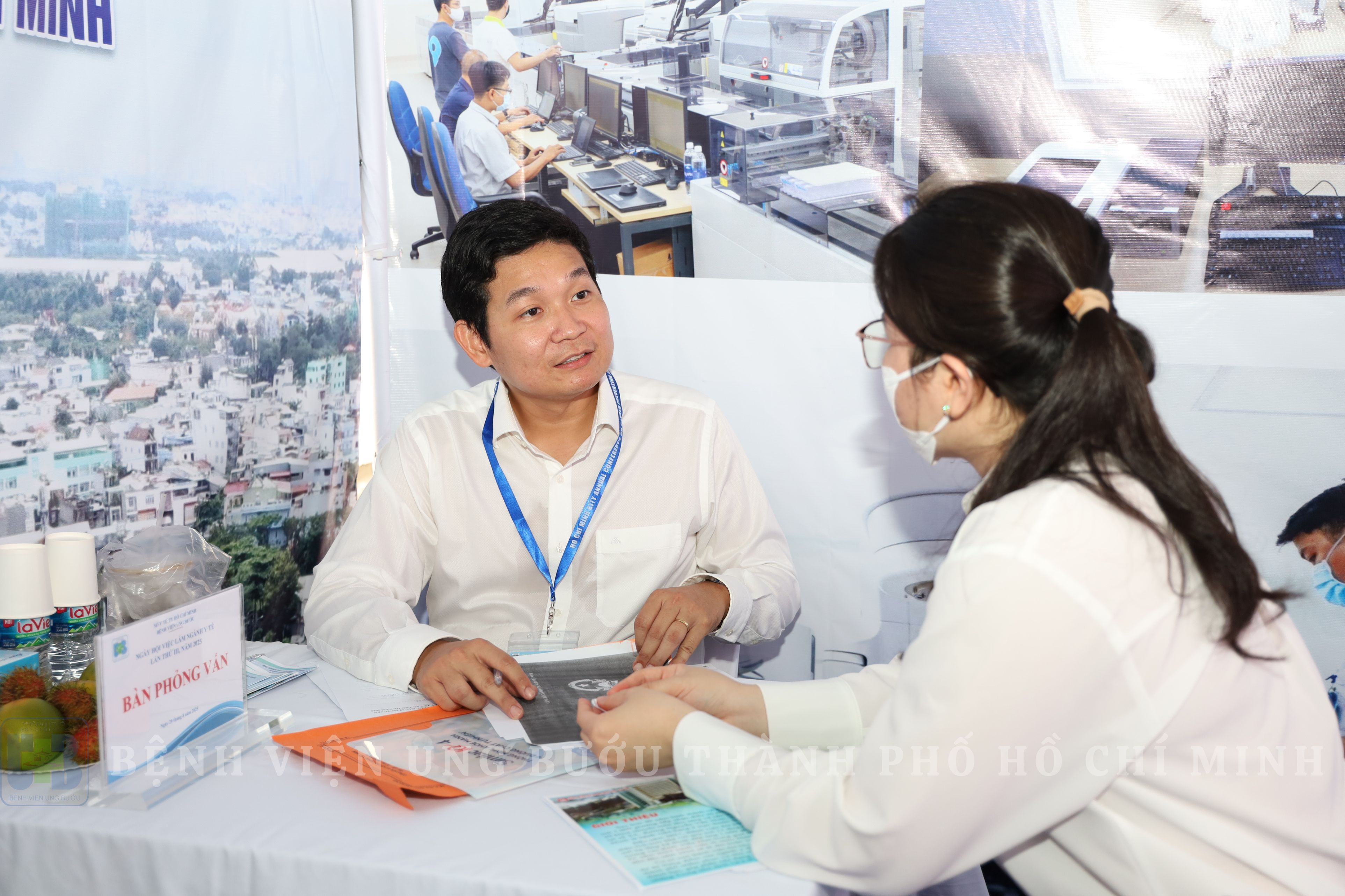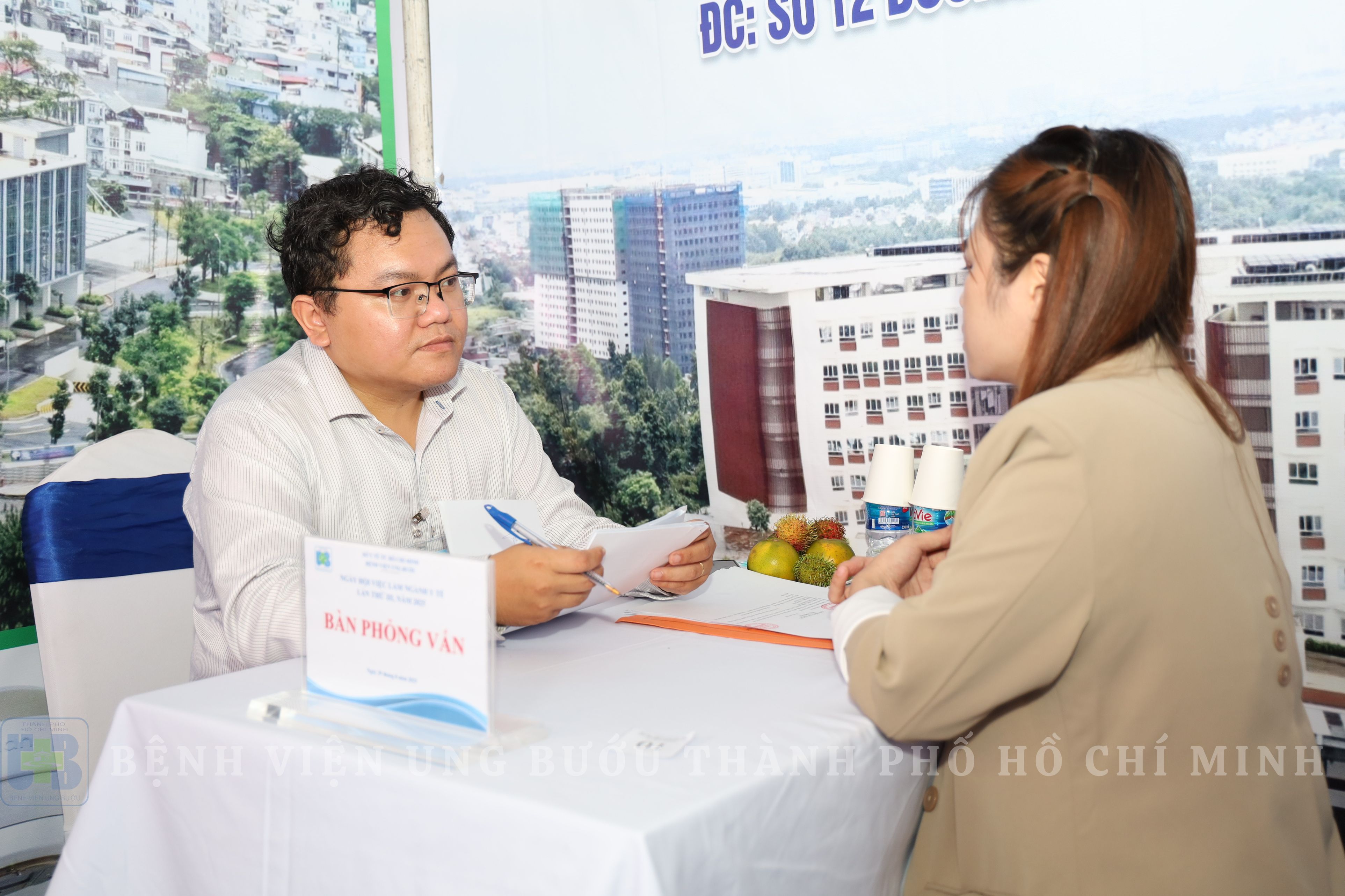 Tại gian hàng của Bệnh viện Ung Bướu TP.HCM, ứng viên được cung cấp thông tin tổng quan về bệnh viện, hướng dẫn nộp hồ sơ và tham gia phỏng vấn nhanh. Hội đồng tuyển dụng gồm: