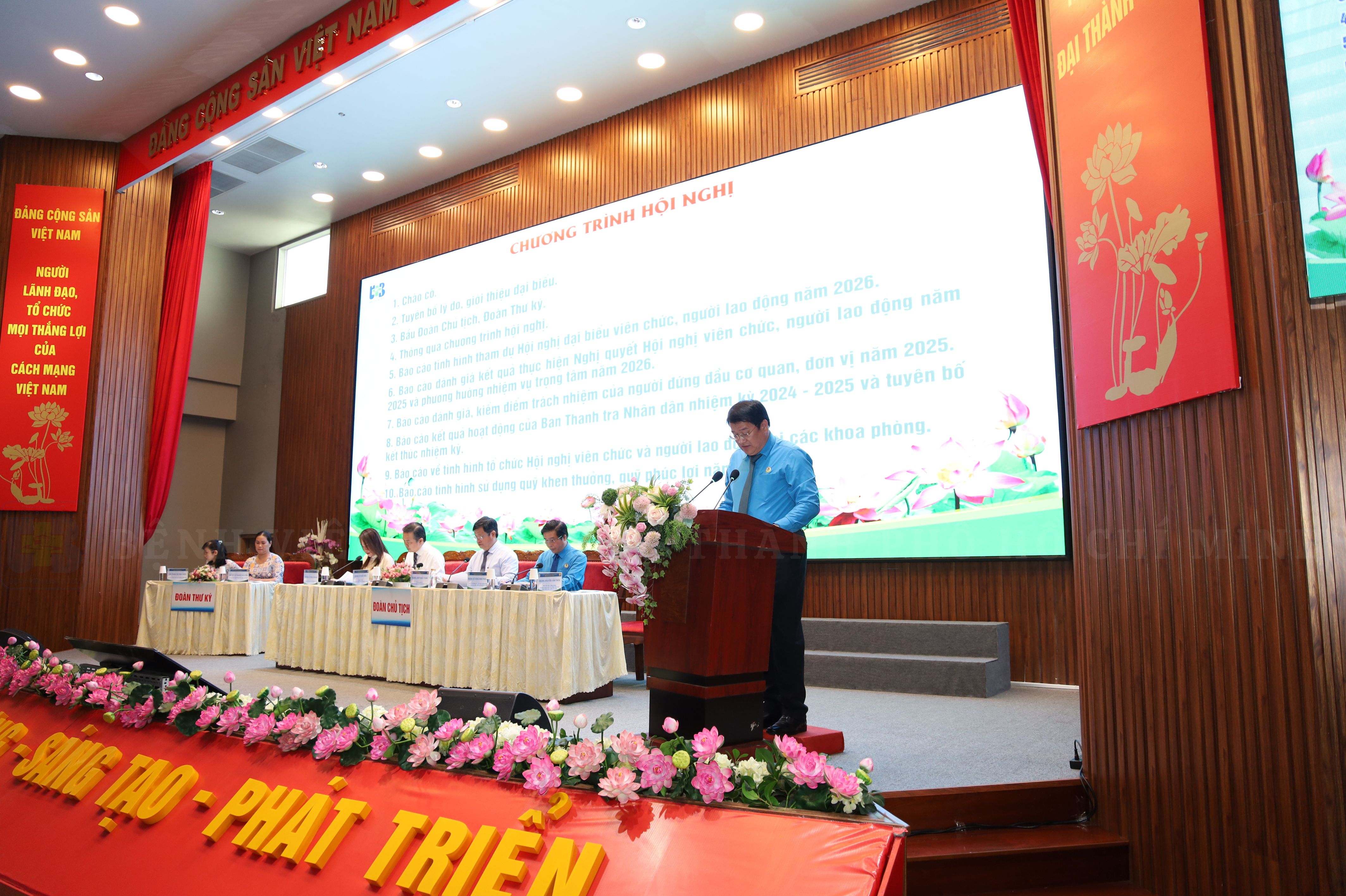 Tại hội nghị, các đại biểu đã nghe báo cáo đánh giá kết quả thực hiện Nghị quyết Hội nghị viên chức, người lao động năm 2025; báo cáo kiểm điểm trách nhiệm của người đứng đầu đơn vị; báo cáo hoạt động của Ban Thanh tra Nhân dân nhiệm kỳ 2024–2025 và phương hướng nhiệm kỳ 2026–2027. Hội nghị cũng dành thời gian thảo luận, đóng góp ý kiến đối với dự thảo Quy chế chi tiêu nội bộ và Quy chế dân chủ cơ sở năm 2026.