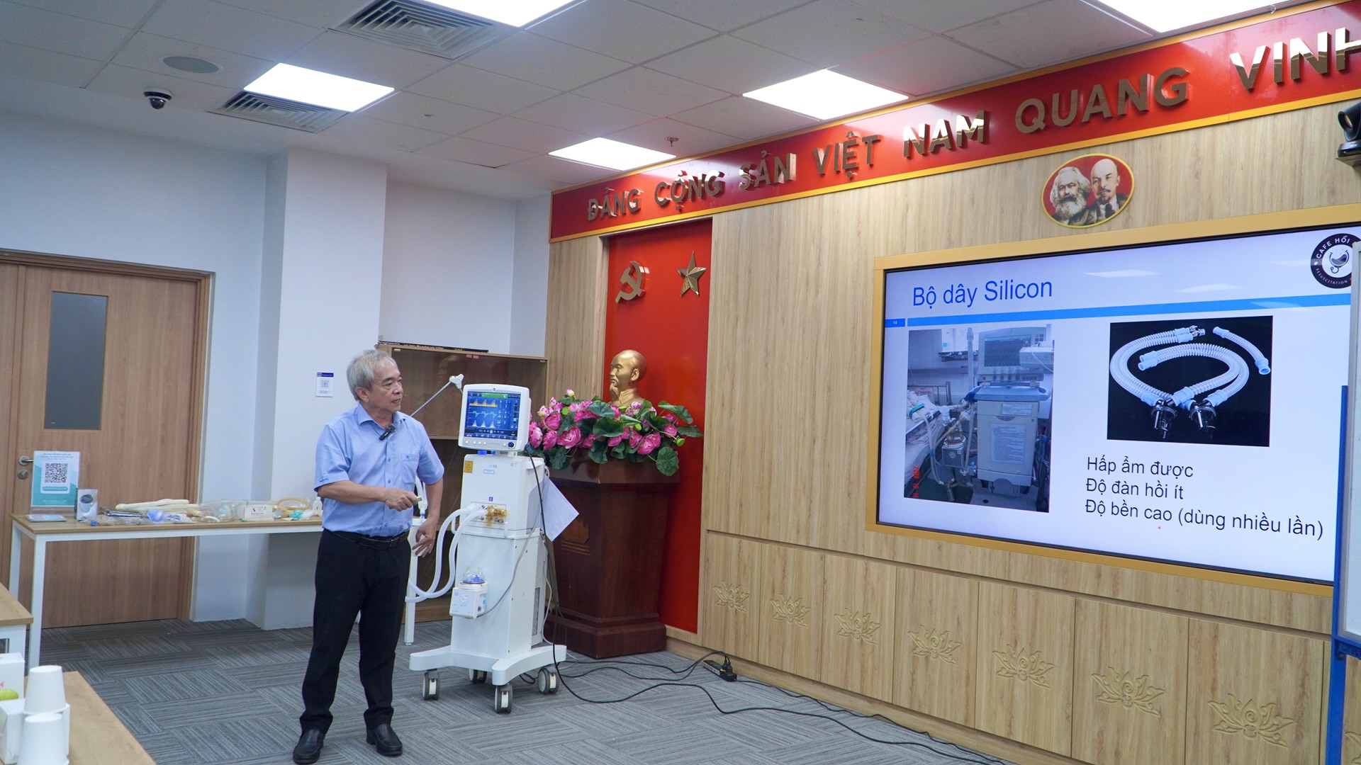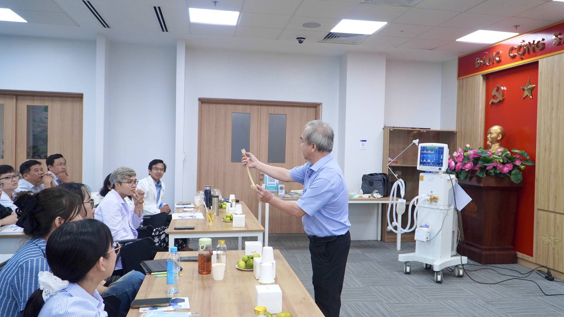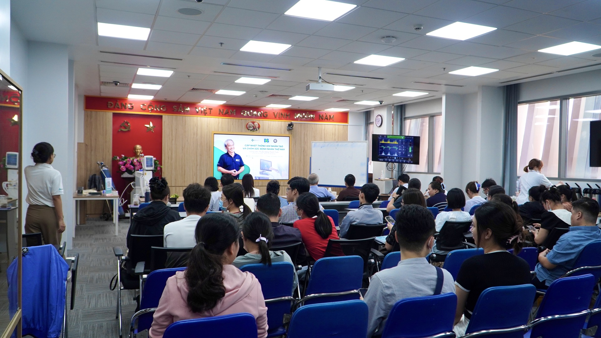 Giảng viên đặc biệt nhấn mạnh những nguy cơ thường gặp khi hỗ trợ thở máy như viêm phổi liên quan máy thở, tổn thương phổi do áp lực hoặc thể tích. Bên cạnh lý thuyết, học viên được thực hành các bước an toàn trong vận hành máy thở, nhận diện sớm biến chứng và xử trí kịp thời nhằm giảm thiểu rủi ro cho người bệnh.