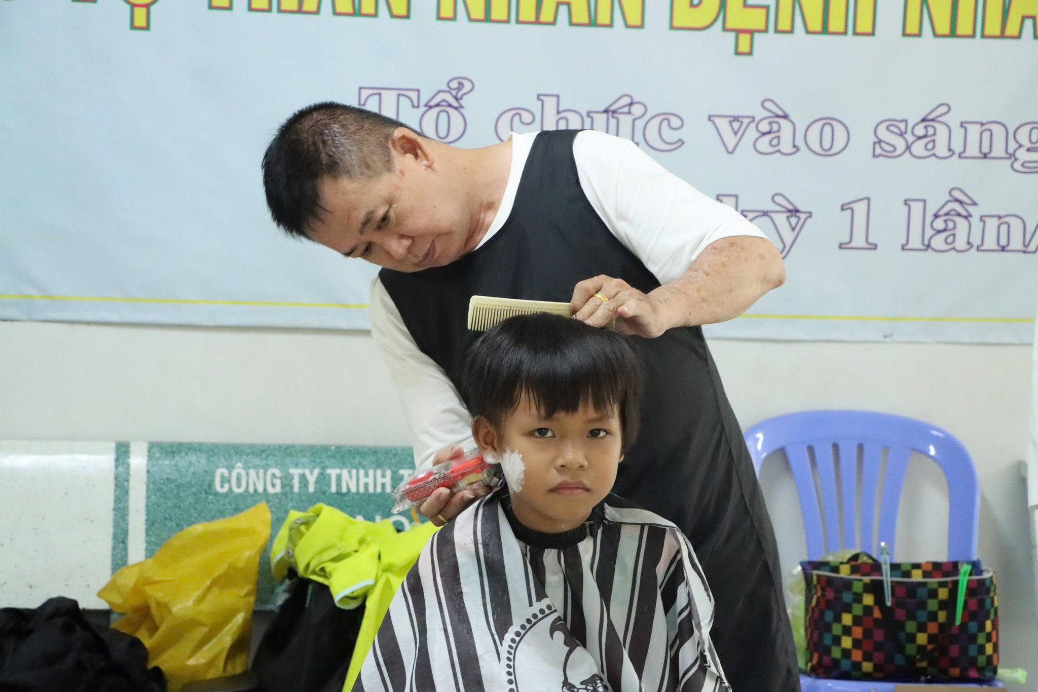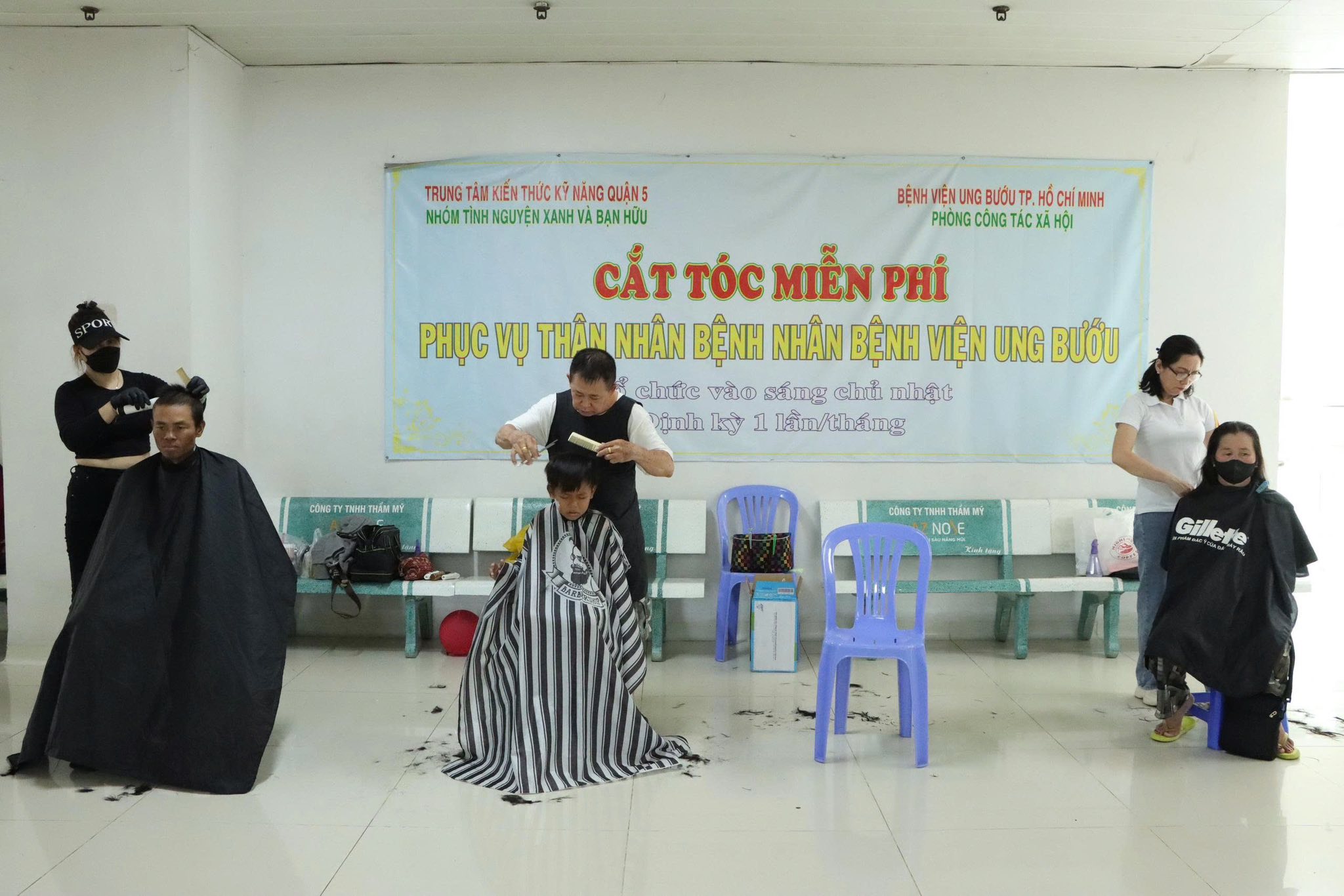 Chương trình “Cắt tóc miễn phí” dành cho bệnh nhân và người nhà được tổ chức đều đặn mỗi tháng một lần tại Bệnh viện Ung Bướu TP.HCM – Cơ sở 2, phối hợp cùng Trung tâm Kiến thức Kỹ năng Quận 5 – Nhóm Tình nguyện Xanh và bạn hữu.