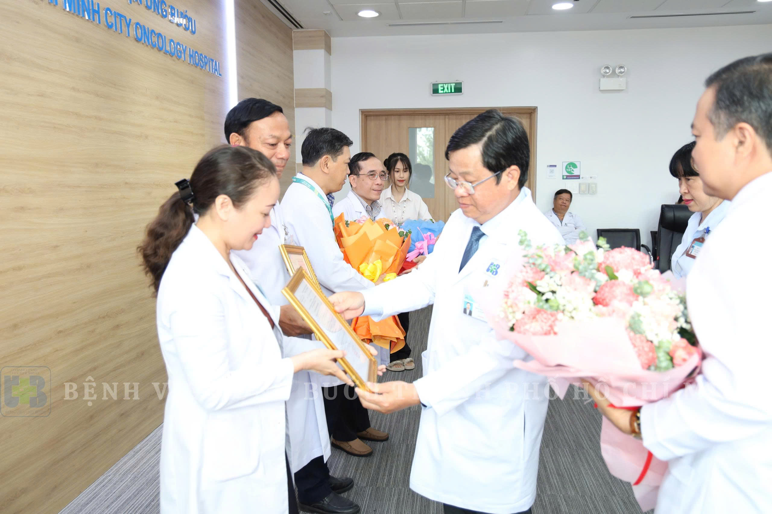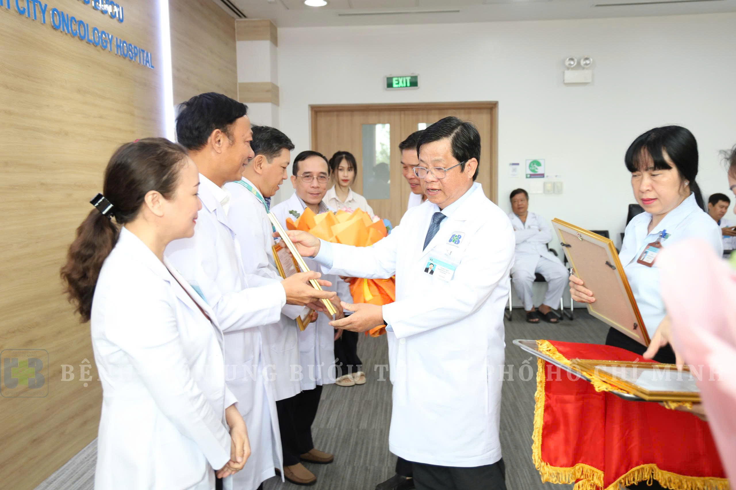 Sáng ngày 08/7/2025, Ban Giám đốc Bệnh viện Ung Bướu TP.HCM đã khen thưởng tập thể ekip y tế thực hiện thành công kỹ thuật xạ trị áp sát trong mô cho một bệnh nhi 5 tuổi mắc sarcôm cơ vân cạnh hậu môn – một trường hợp hiếm gặp, khó xử trí trong lâm sàng, được chuyển đến từ Bệnh viện Nhi trung ương, Hà Nội sau hội chẩn. Đây là ca xạ trị áp sát cho bệnh nhi thứ 5 đã được 2 bệnh viện phối hợp điều trị thành công.