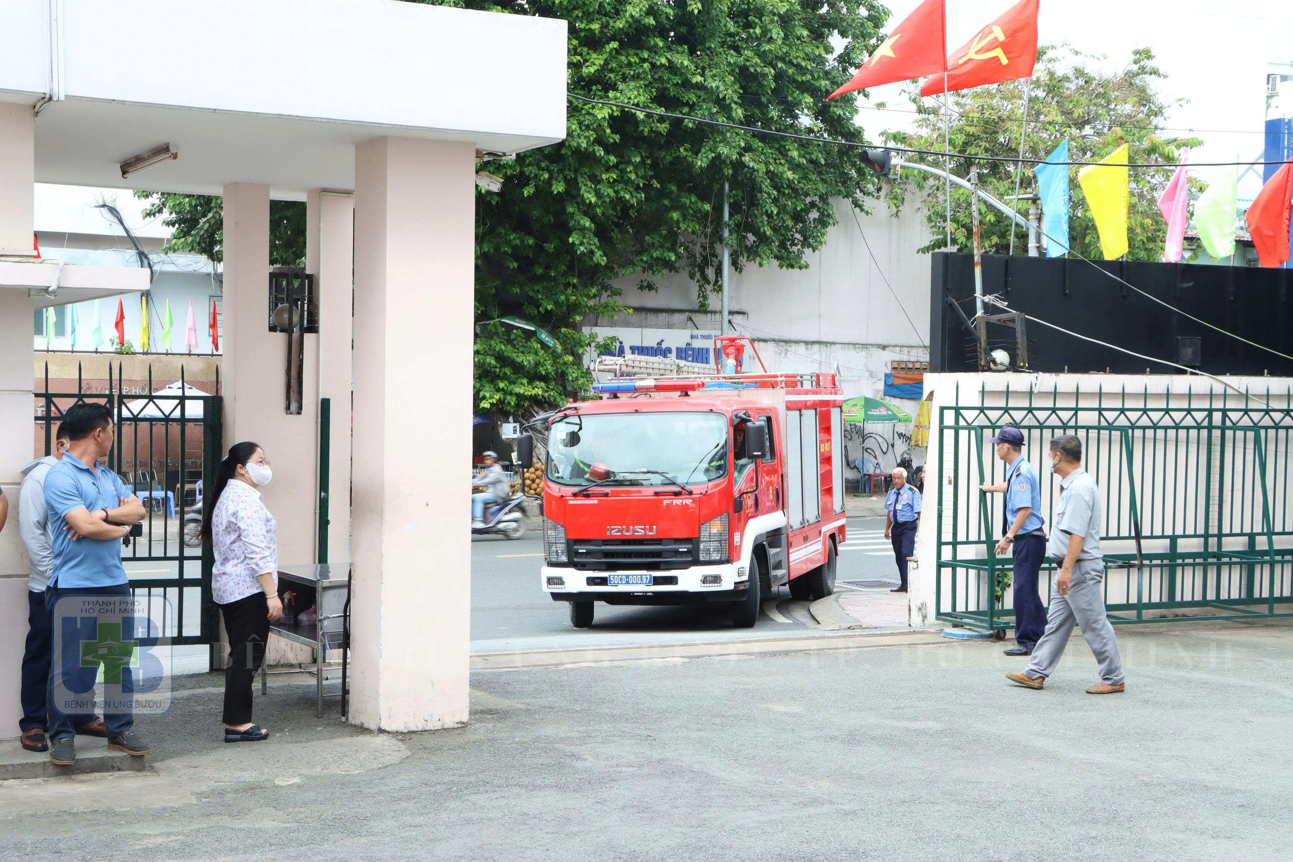 Trong phần diễn tập, tình huống cháy giả định xảy ra tại Khu Xạ trị gia tốc, Đội Phòng cháy chữa cháy cơ sở đã nhanh chóng xử lý tín hiệu báo cháy, hướng dẫn sơ tán an toàn, triển khai phương tiện chữa cháy và phối hợp lực lượng chức năng thực hiện công tác cứu nạn cứu hộ theo đúng quy trình.