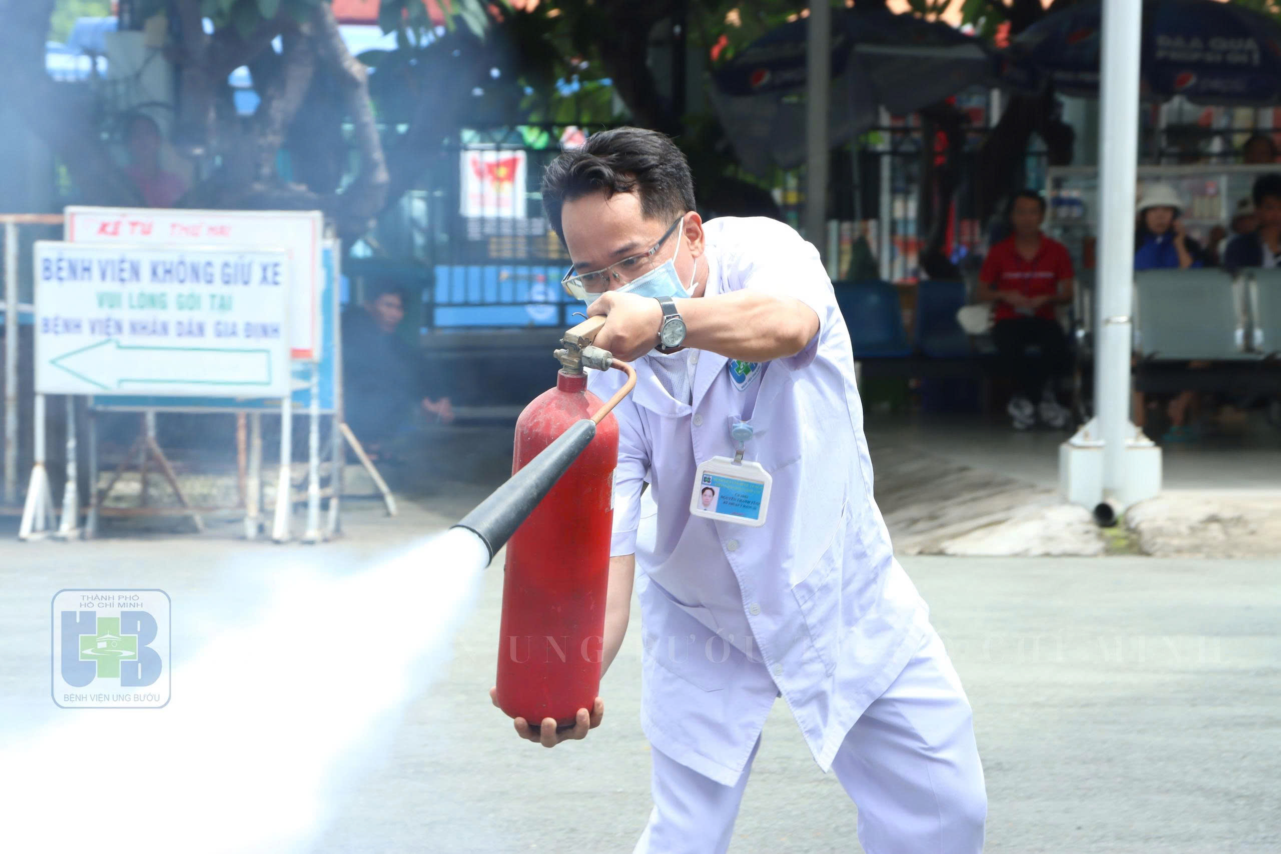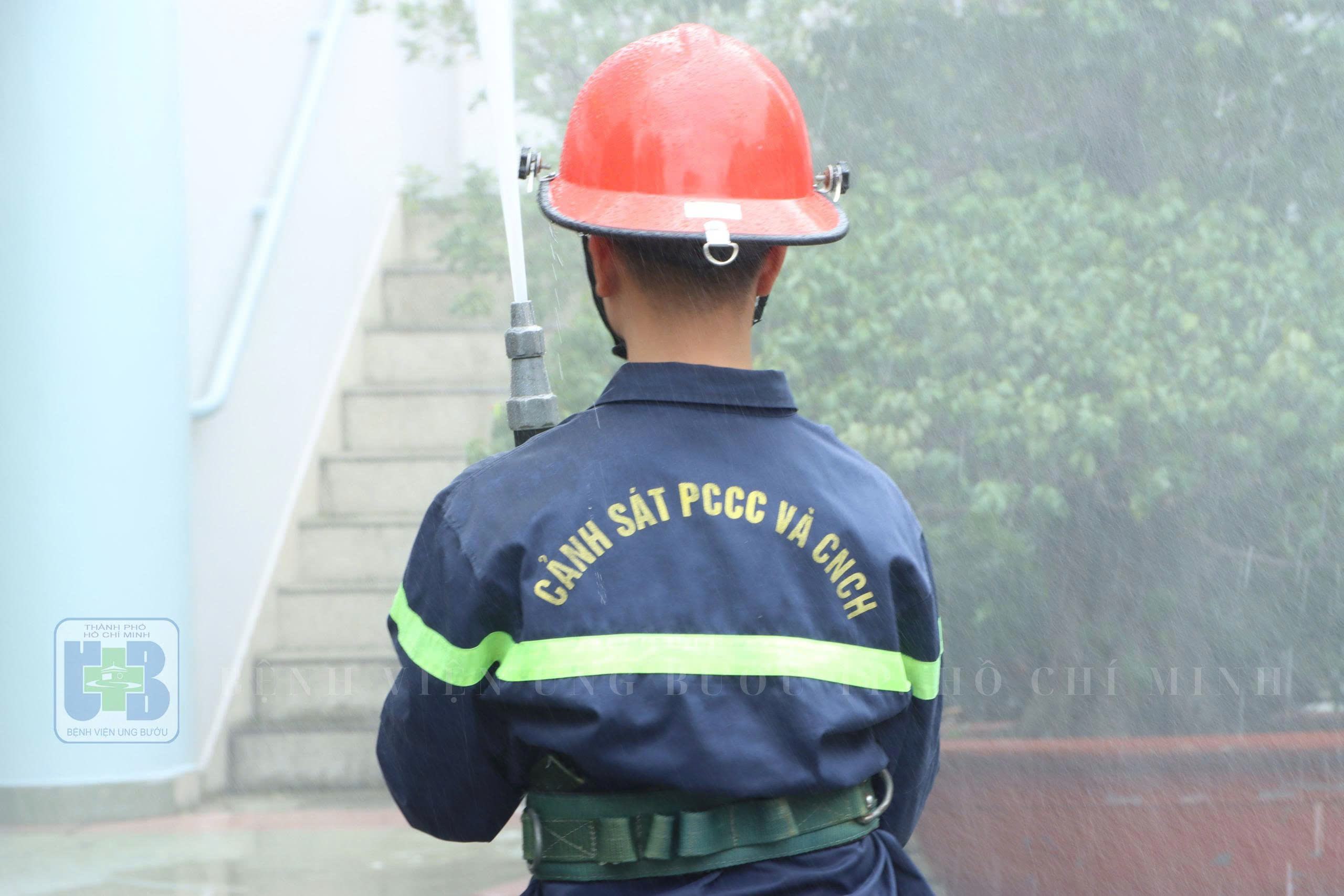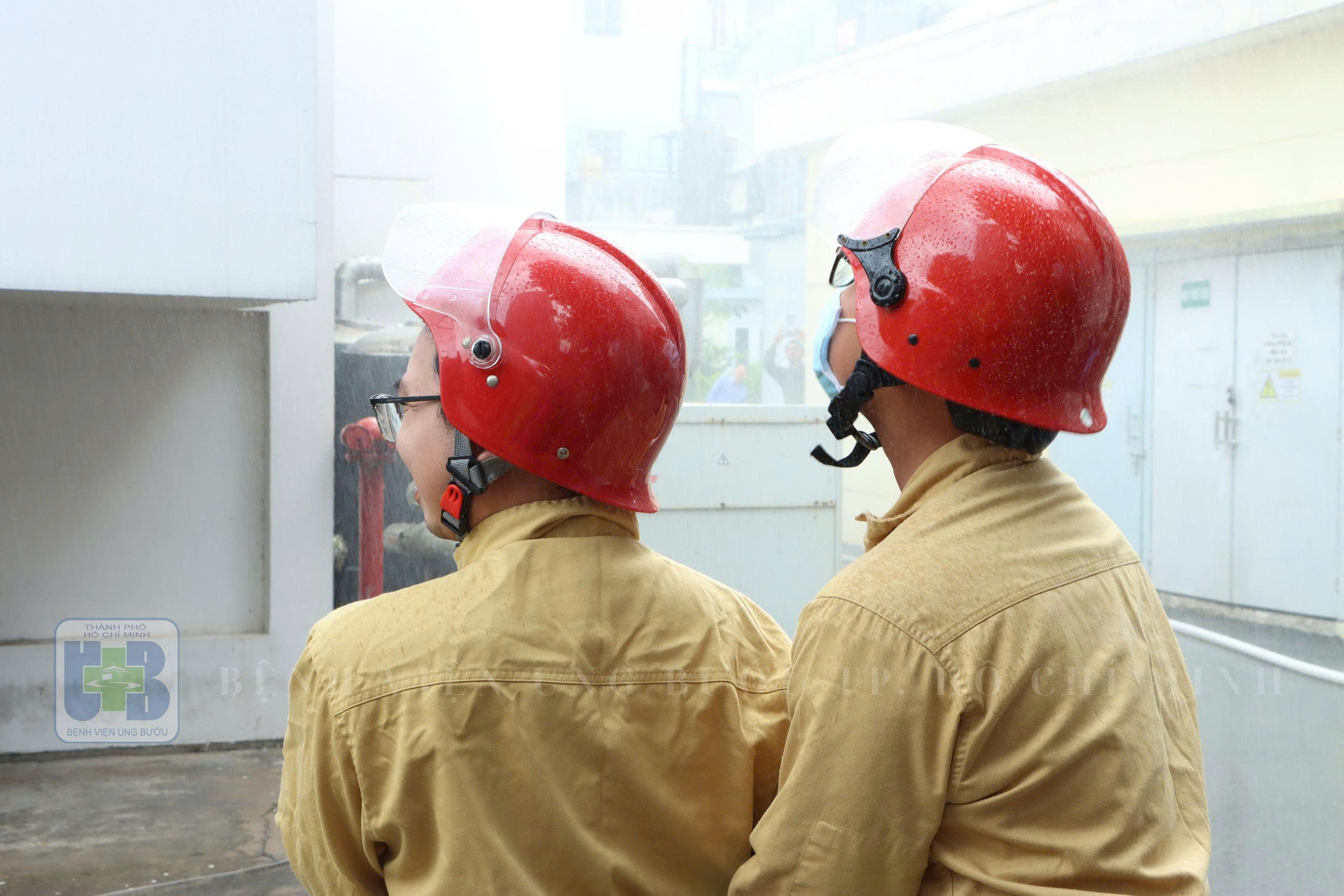 Trong phần diễn tập, tình huống cháy giả định xảy ra tại Khu Xạ trị gia tốc, Đội Phòng cháy chữa cháy cơ sở đã nhanh chóng xử lý tín hiệu báo cháy, hướng dẫn sơ tán an toàn, triển khai phương tiện chữa cháy và phối hợp lực lượng chức năng thực hiện công tác cứu nạn cứu hộ theo đúng quy trình.