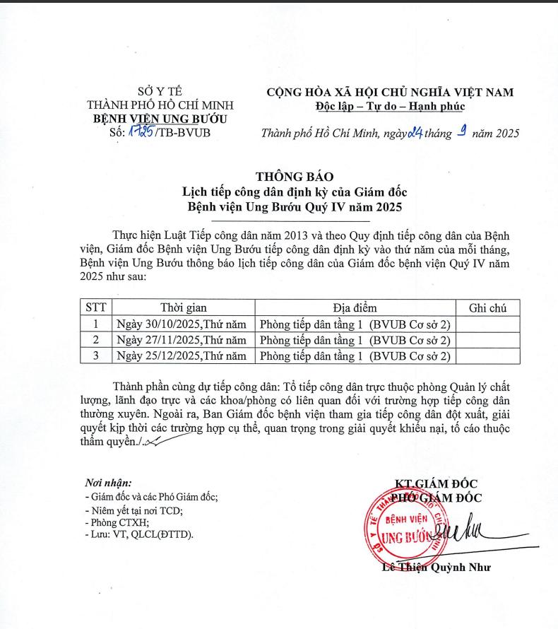 Tin tức - Hoạt động bệnh việnThông báo Lịch tiếp công dân định kỳ của Giám đốc Bệnh viện Ung Bướu Quý IV năm 2025 Posted on 01/10/202518/11/2025 by Công tác xã hội 01 Th10